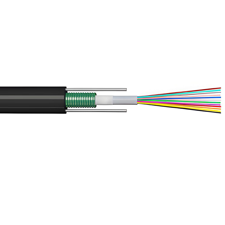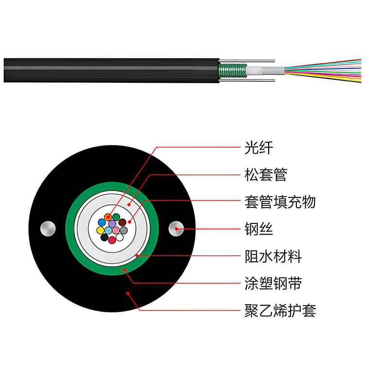 GYXTZW 型光缆将 250 μm 光纤置于高模量塑料制成的松套管内,套管内填充阻水膏;套管外沿缆向纵包一层 PSP(钢塑复合带)。在 PSP 与松套管之间加入阻水材料,使光缆结构紧凑并具备优良的防水性能。钢带两侧各布置一根平行钢丝作为加强件,最外层挤覆阻燃型 PE 护套完成成缆。